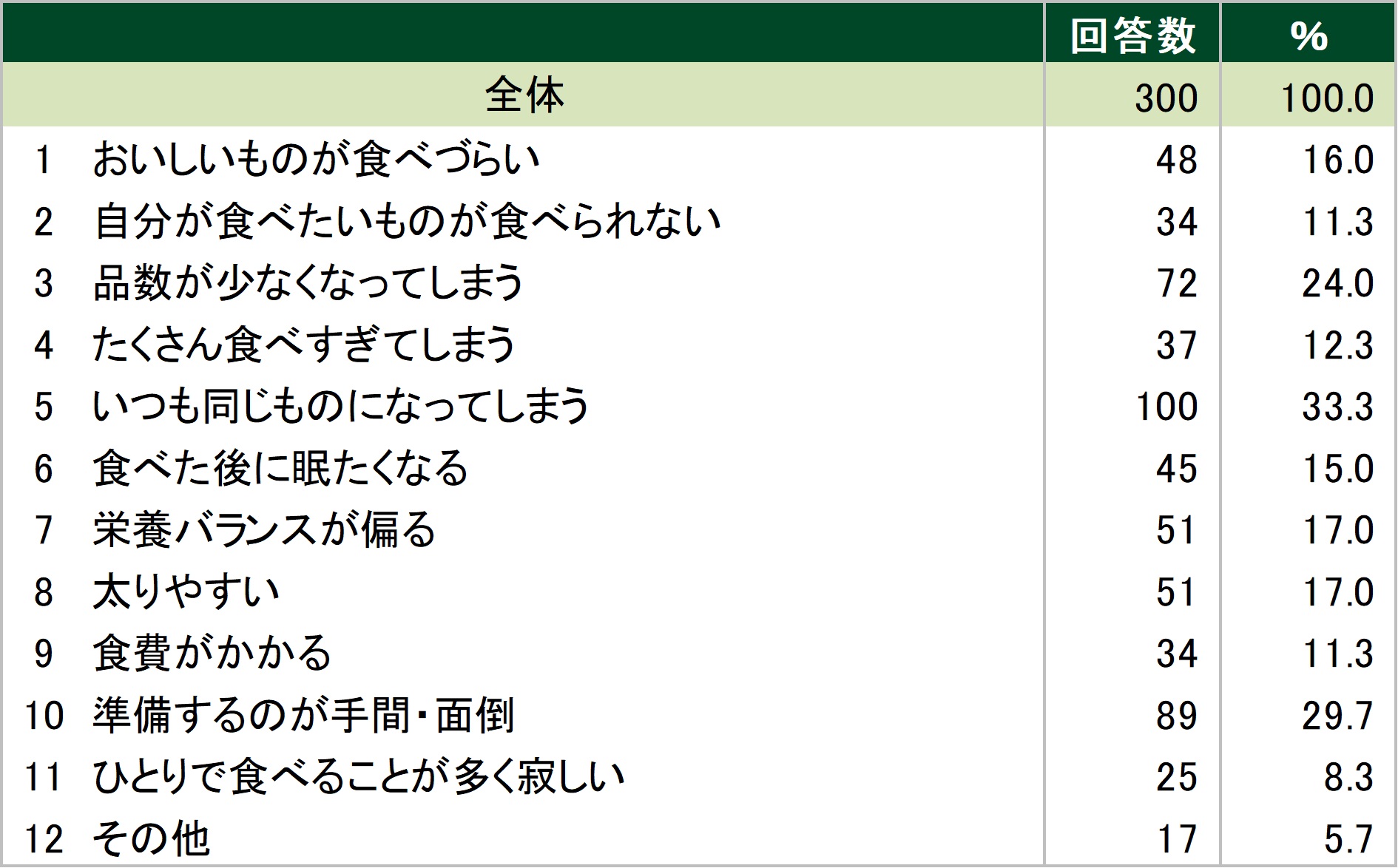テレワーク時の昼食に感じる不満としては、「いつも同じものになってしまう」「準備するのが手間・面倒」「品数が少なくなる」「太りやすい」「栄養バランスが偏る」といったことが上位。忙しい仕事の合間に必ずしも満足できる昼食をとれておらず、健康面にも気を遣う必要があるビジネスパーソンの悩みがうかがえる。