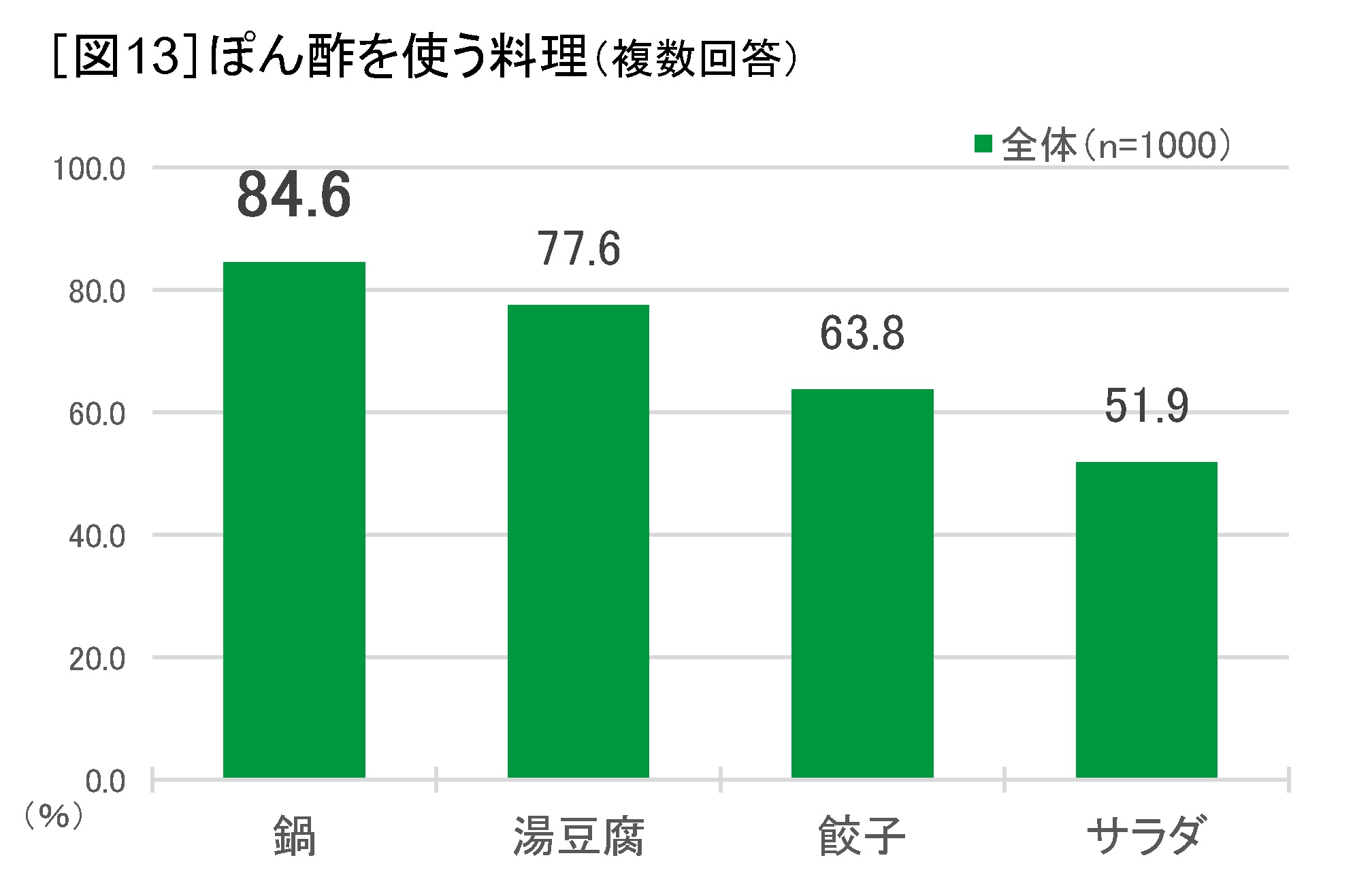 また、そんな「ミツカン 味ぽん」などのぽん酢を使う料理を答えてもらいました。「鍋料理」(84.6%)がいちばん多いものの、「餃子」(63.8%)や「サラダ」(51.9%)に使う人も半数を超えています[図13]。ぽん酢はどんな料理とも相性が合うようです。