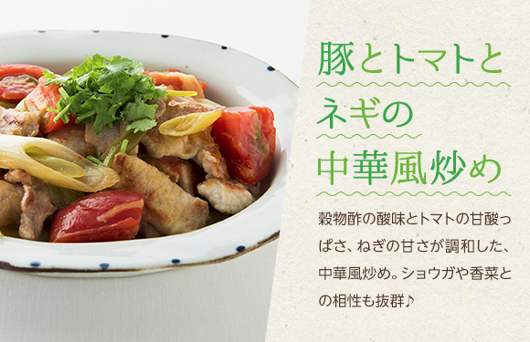 穀物酢の酸味とトマトの甘酸っぱさ、ねぎの甘さが調和した、中華風炒め。ショウガや香菜との相性も抜群♪