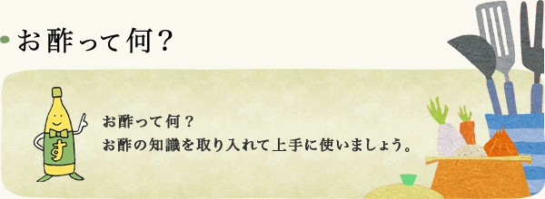 お酢の種類は原料別にたくさんあり、穀物酢、米酢、米黒酢、りんご酢など、それぞれに味や香りも異なります。たとえば、すっ きりとした酸味が特徴の穀物酢、まろやかな酸味の米酢、フルーティな酸味のりんご酢、コクのある酸味の黒酢など、原料や製造方法の違いが各お酢の味や香り といった特徴となって現れます。