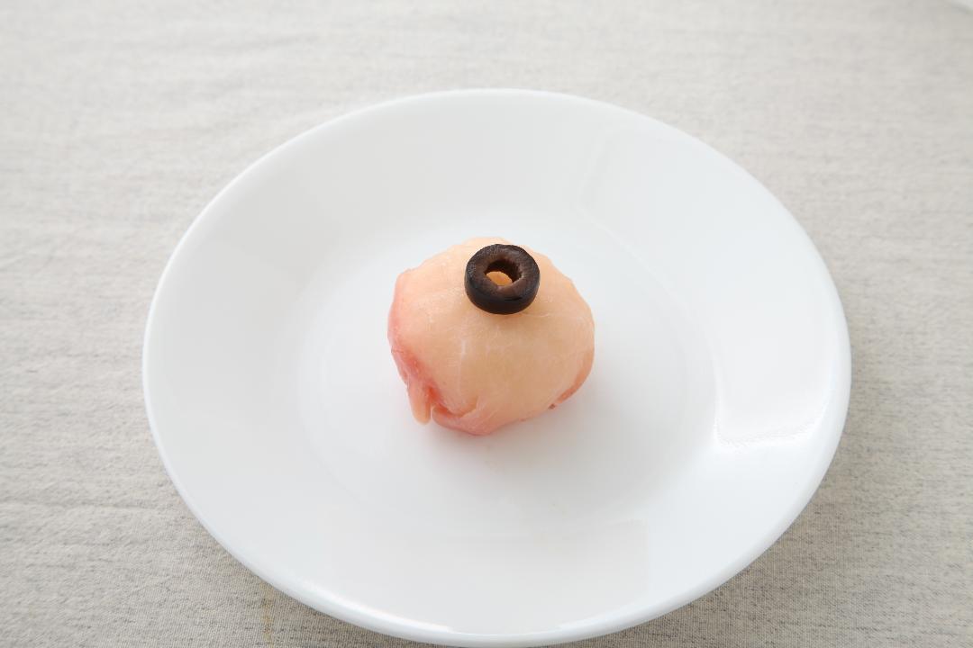 - 2すし飯を2等分し丸くにぎる。生ハムを巻きつけ、スライスしたブラックオリーブをのせる。