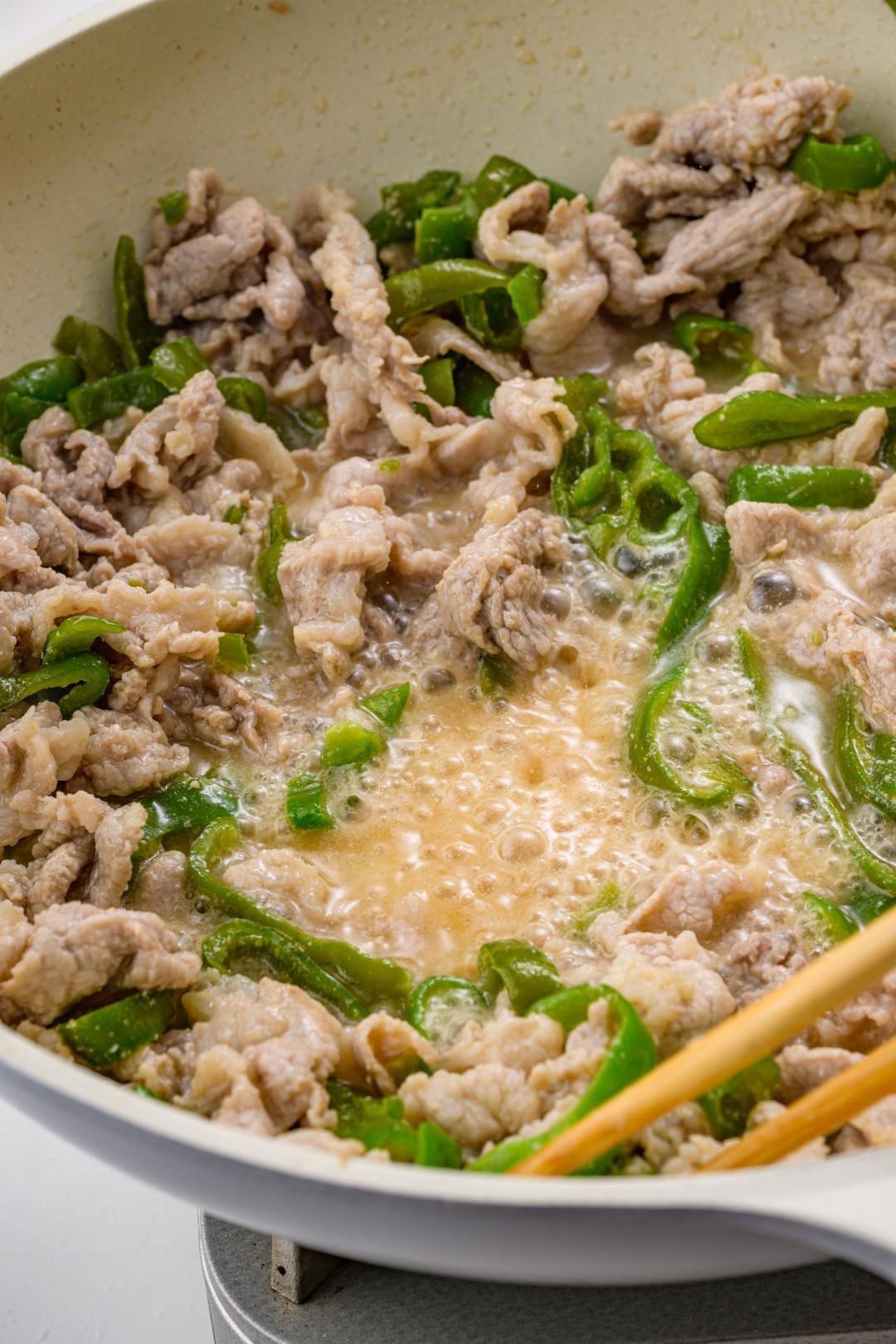 - 1豚肉は細切りにする。ピーマンはヘタと種を取り、細切りにする。