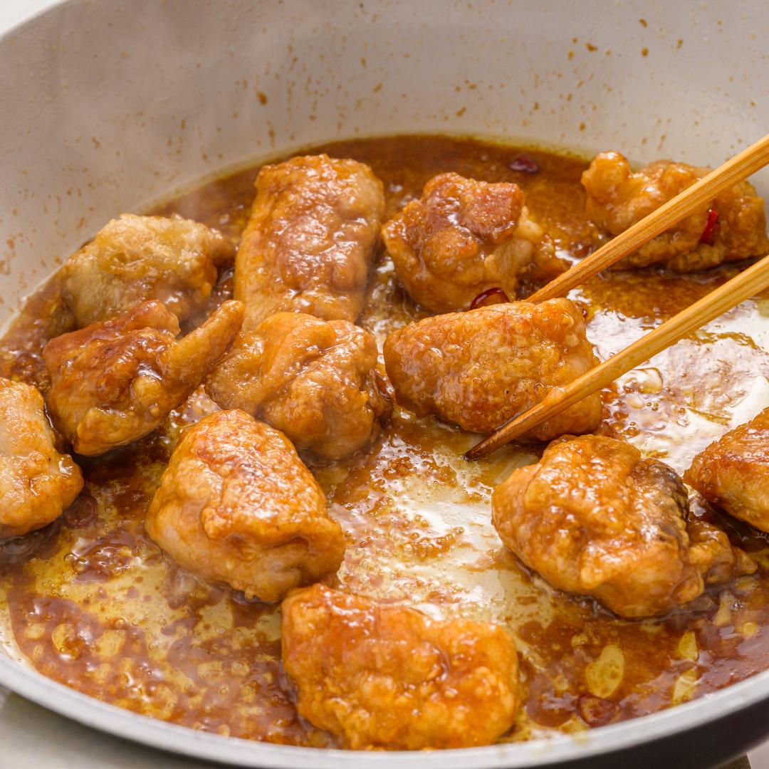 - 2フライパンにオリーブオイル、にんにくを入れ中火で炒める。にんにくがきつね色になったら取り出す。鶏肉を入れ、両面こんがりと焼き色がつくまで炒める。赤とうがらし、「味ぽん」を加え、炒めからめる。