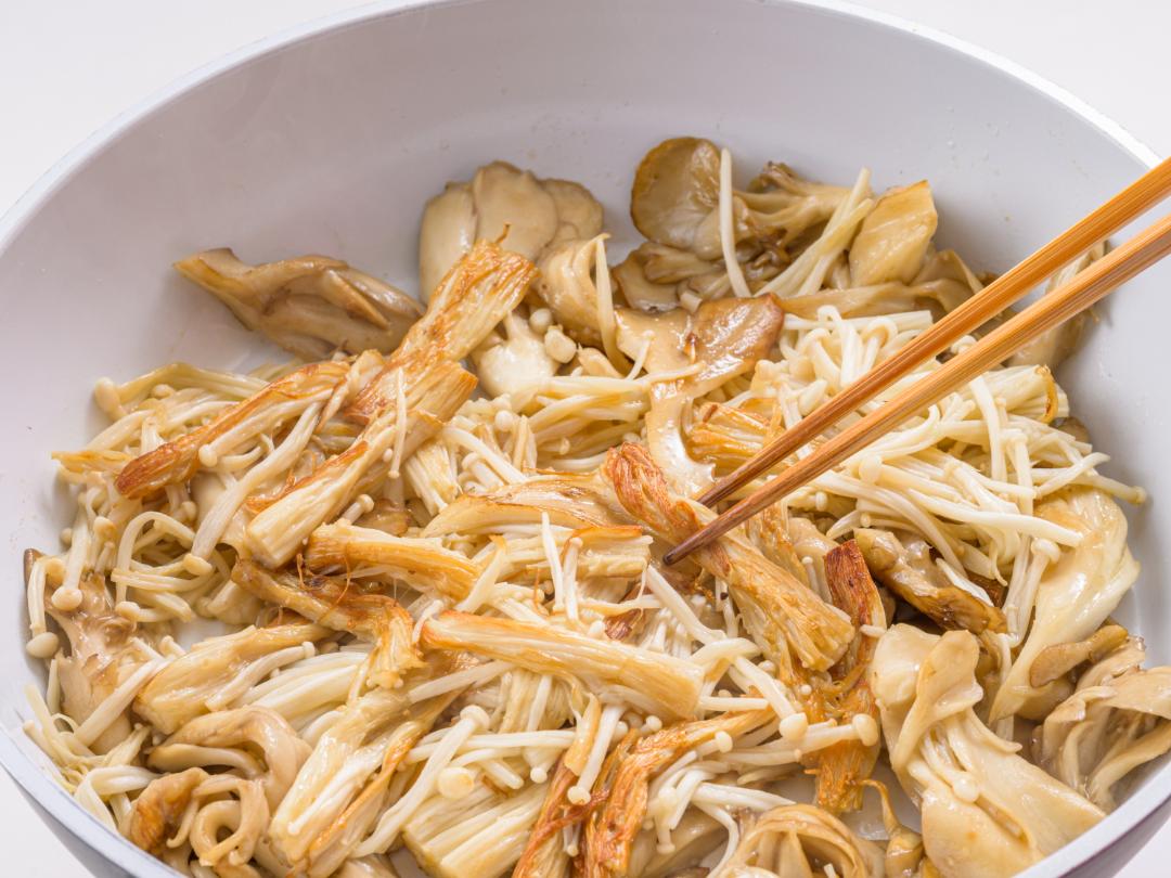 - 2フライパンを中火にかけ、まいたけとえのきだけを入れ、焼き目がつくまで触らずに焼く。上下を返して全体に焼き目がつくまで焼く。