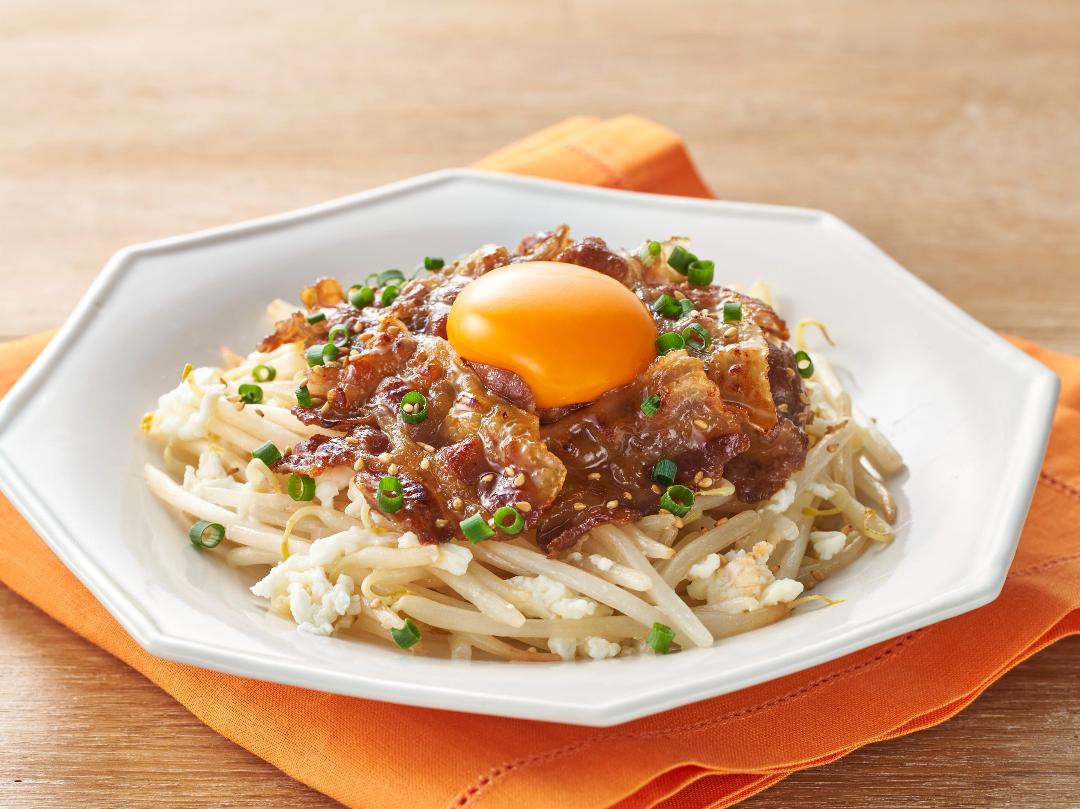 しゃきしゃきのもやしと、「カンタン酢」で炒めた甘辛い豚肉は相性バツグン!卵黄がとろ~りとからみ、ご飯が進む一品です。卵白も一緒に炒めるのでムダになりません!