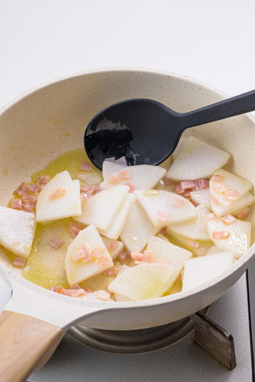 - 1大根は皮をむき、3mm厚さのいちょう切りにする。ベーコンは粗みじんに切る。