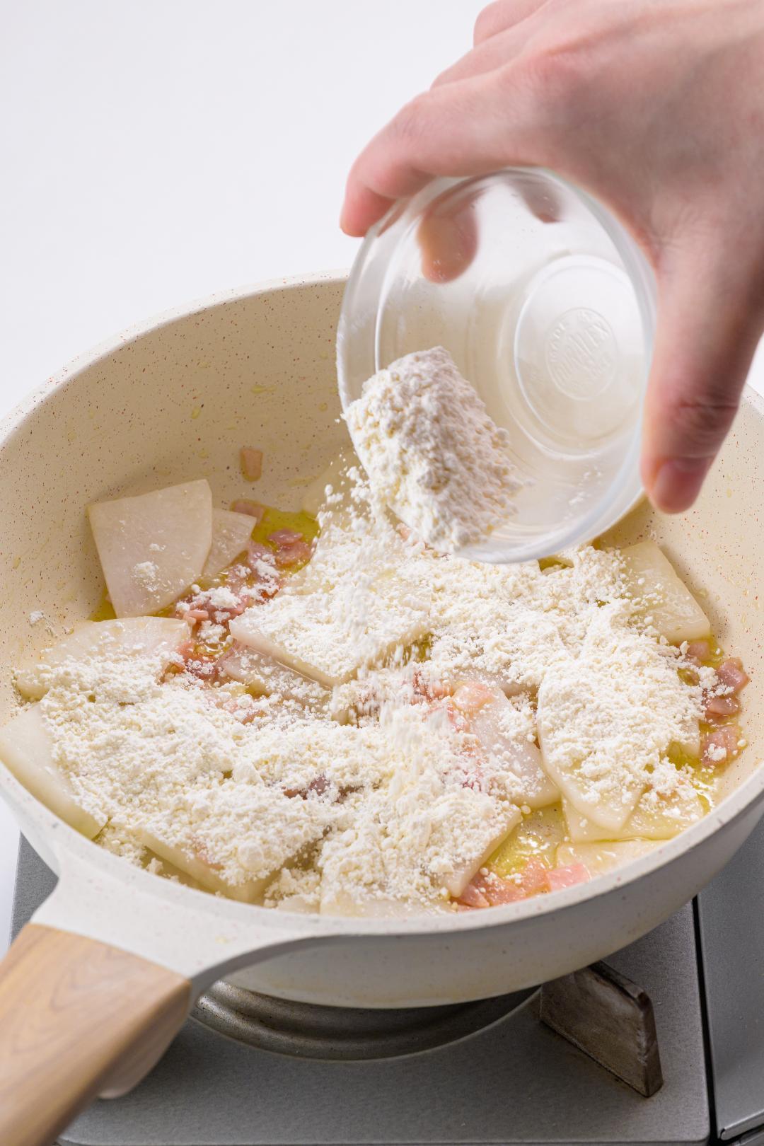 秋冬においしい大根を洋風メニューで。だしの旨味が感じられるクリーミーなソースが大根によく合います。フライパン1つでグラタンベースができるのも手軽です。