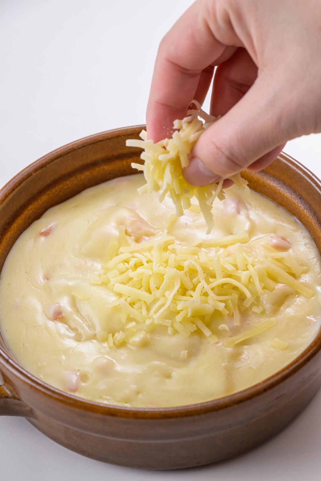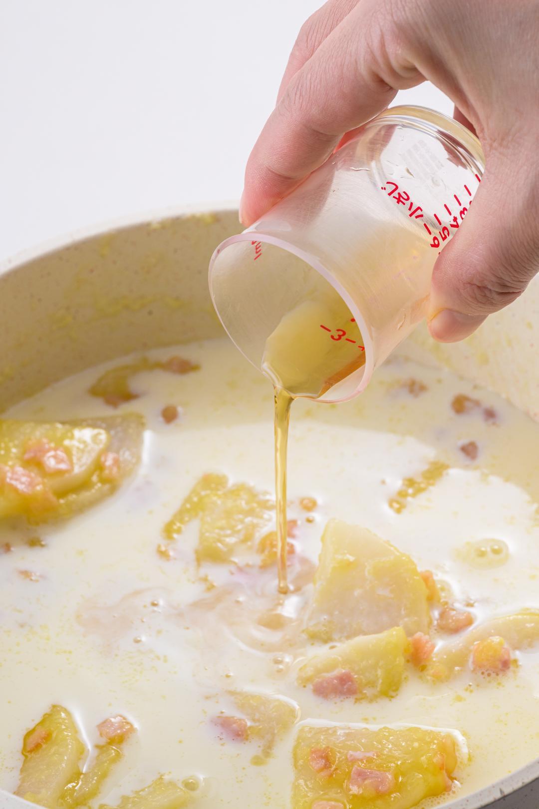 - 43に牛乳、「プロが使う味 白だし」を加え、とろみが出るまで加熱し、白こしょうを加える。