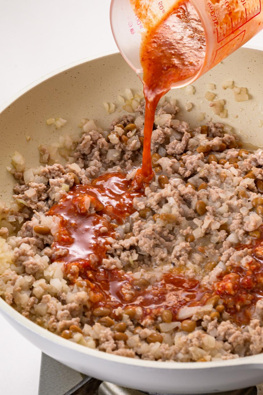 - 2フライパンにごま油をいれて中火にかけ、たまねぎ、ひき肉の順に加えて3~4分炒める。ひき肉に火が通ったら、納豆を加えてさっと炒め合わせ、<A>を回しかける。