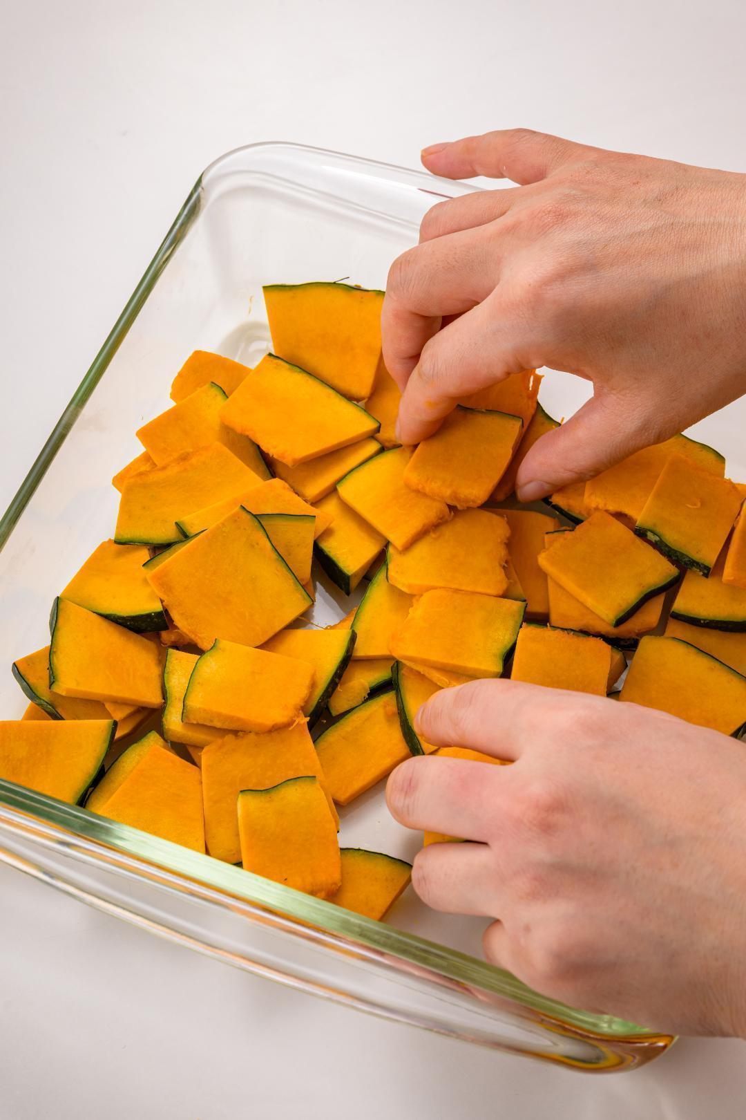 - 1かぼちゃは一口大に切ったあと、4mm幅の薄切りにし、耐熱容器に広げる。ふんわりとラップをし、電子レンジ(600W)で約4分半加熱する。