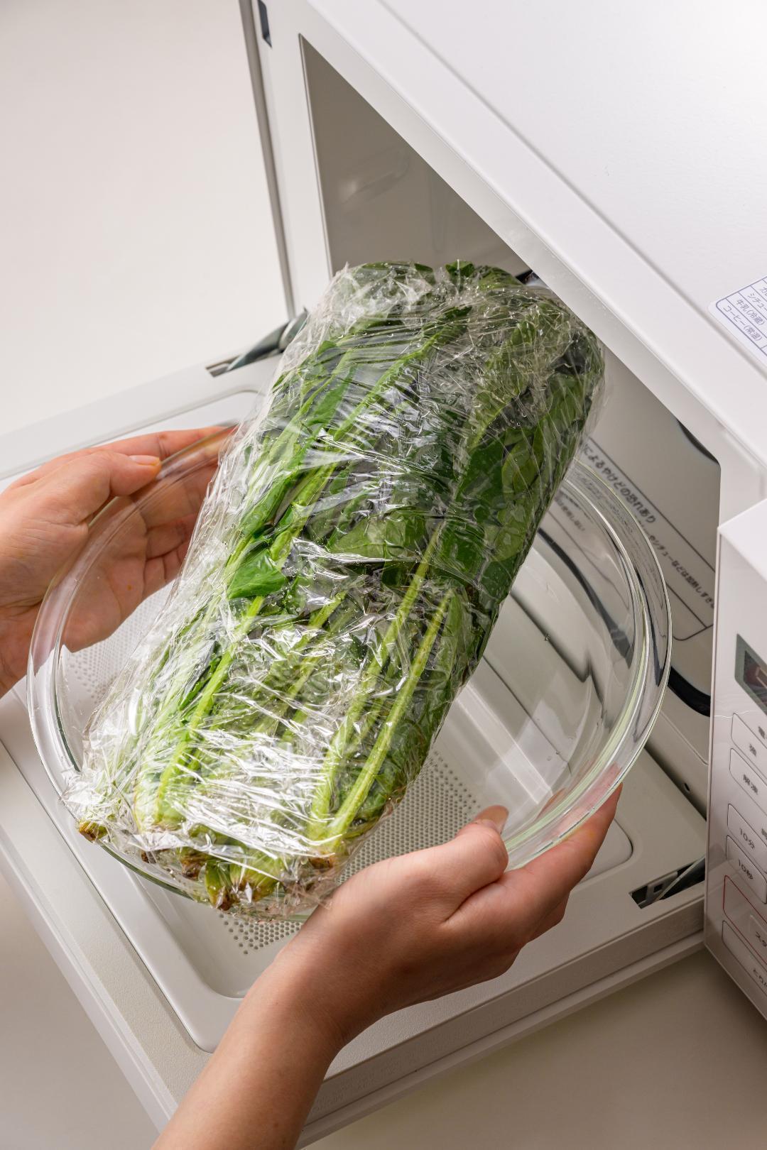 - 2ほうれんそうはラップで包み、耐熱容器にのせ、電子レンジ(600W)で約2分加熱する。水にさらし、よく水けをきり、4cm長さに切る。1に加える。