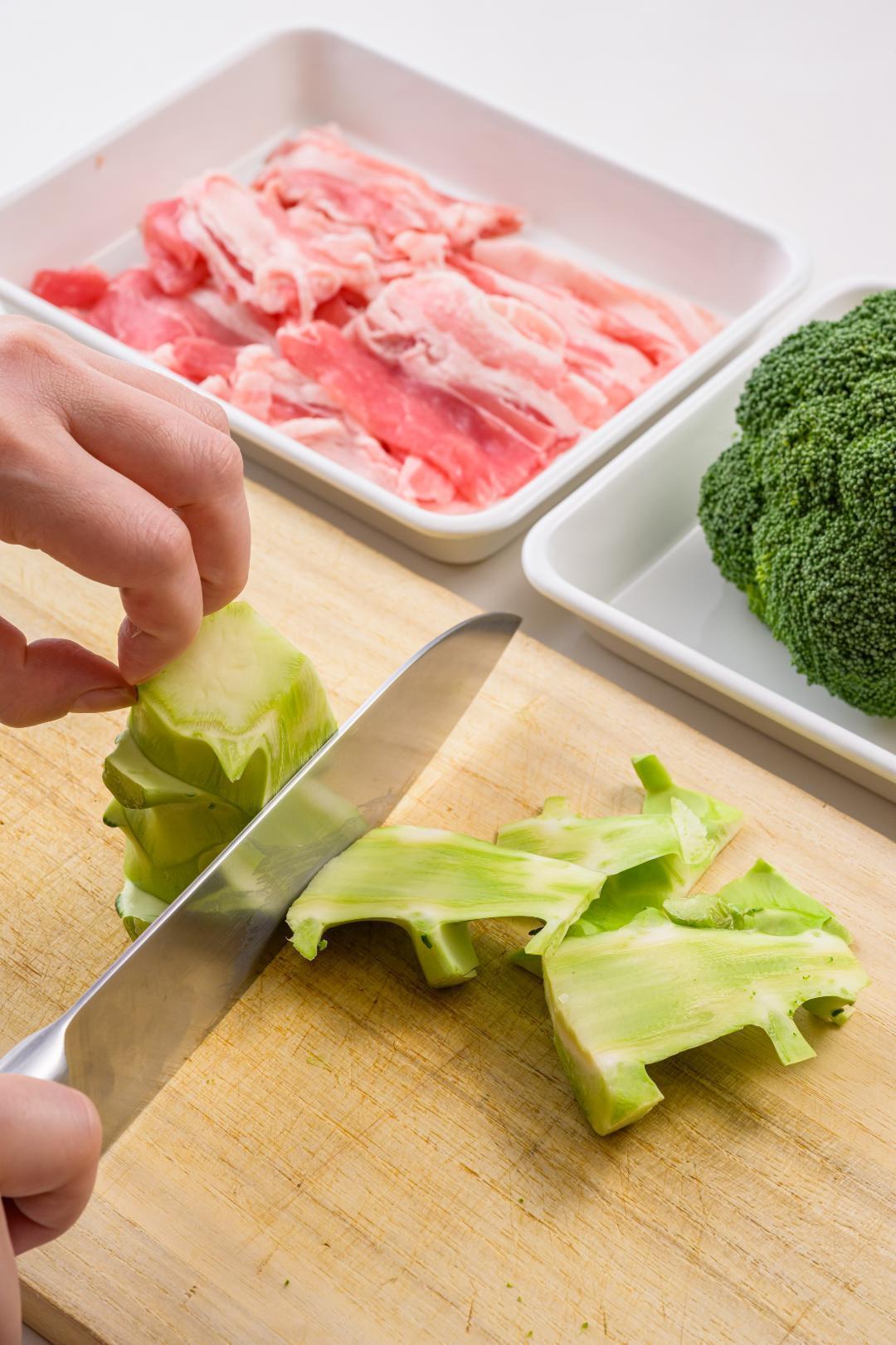 - 1豚バラ肉は食べやすい大きさに切る。ブロッコリーは茎と小房に分ける。茎は根元の固い部分を切り落とし、皮を厚めにむいて、短冊切りにする。