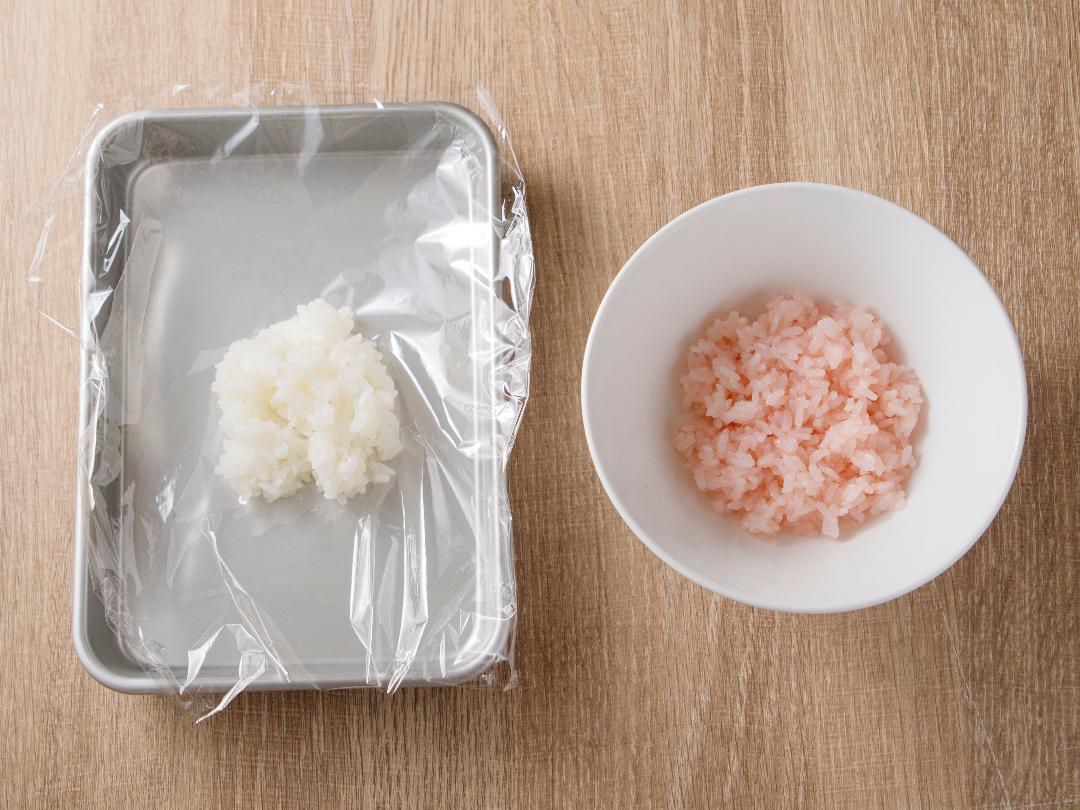 - 1温かいご飯に、「すし酢 昆布だし入り」をきるように混ぜ合わせてすし飯を作る。80gと40gに分ける。80gのすし飯は温かいうちに桜でんぶを混ぜ、ピンクのすし飯を作る。40gのすし飯は白いまま使う。