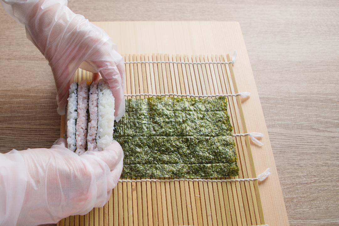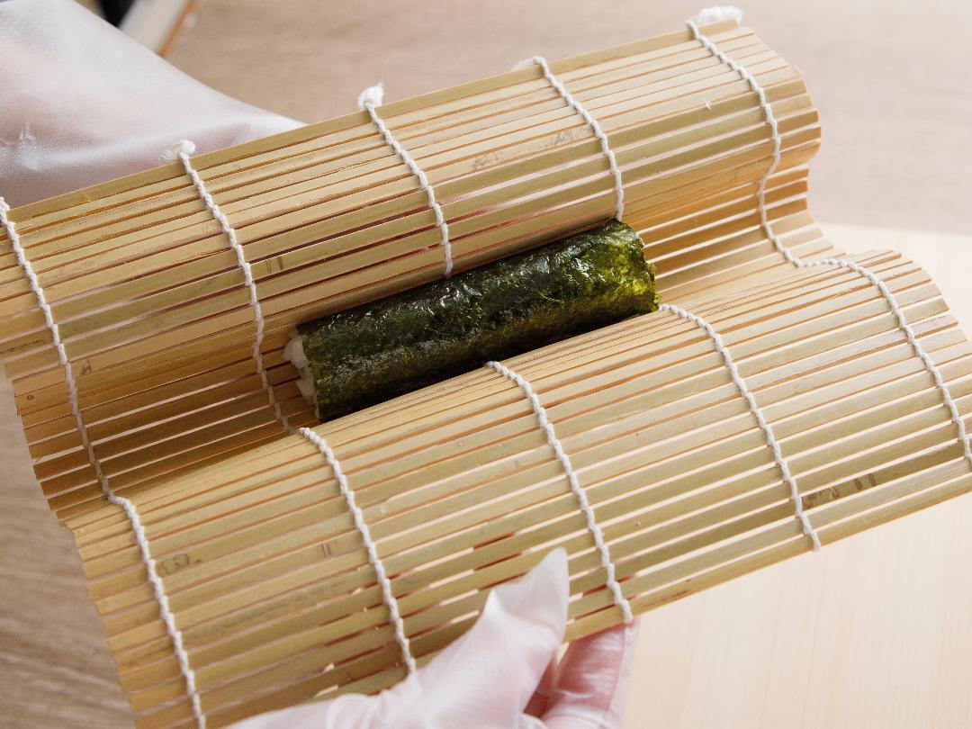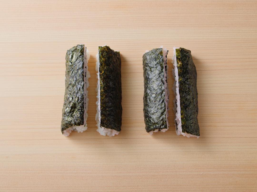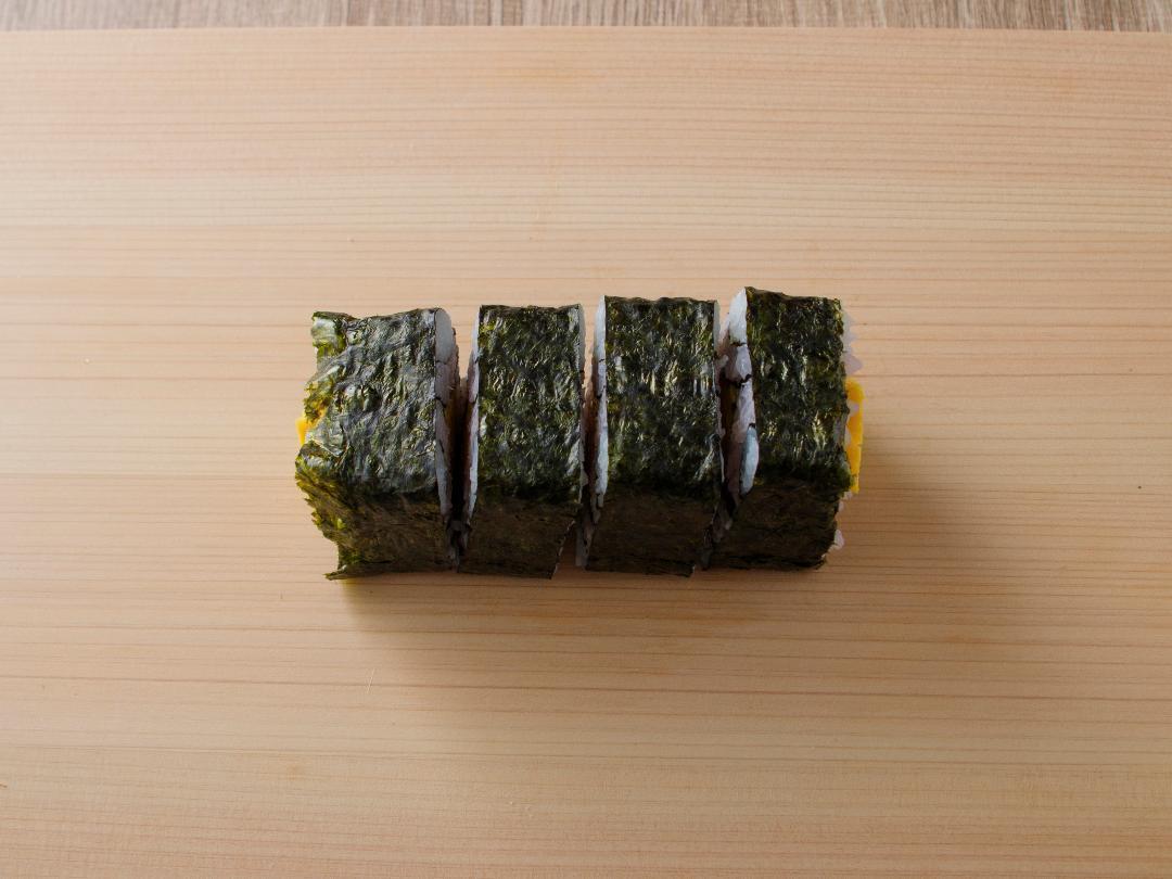 - 10最後に上から巻きすをかぶせて、角が四角くなるように形を整える。左右の端を整え、4貫に切る。