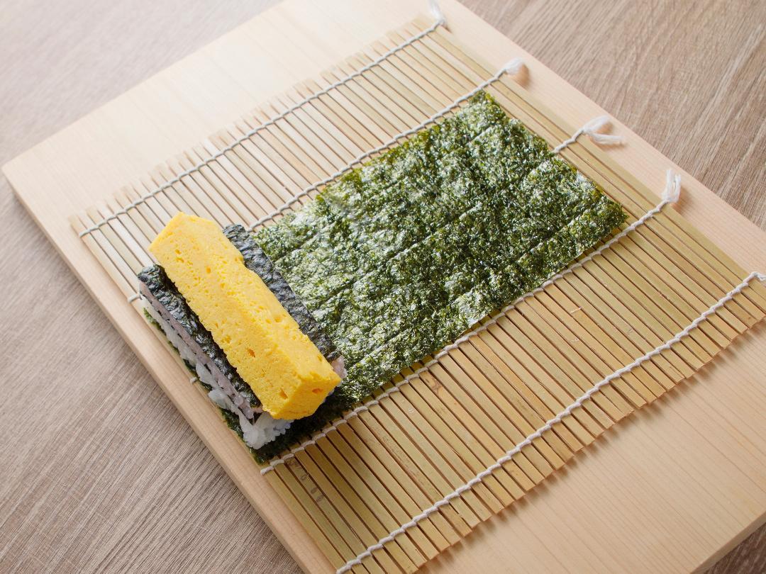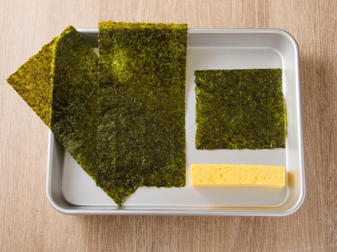 - 2焼のりは半切りを2枚(全形を切る場合は、縦横の長い方を半分に切る)と、半切りの長辺を半分に切ったものを1枚用意する。卵焼きを1本用意する。