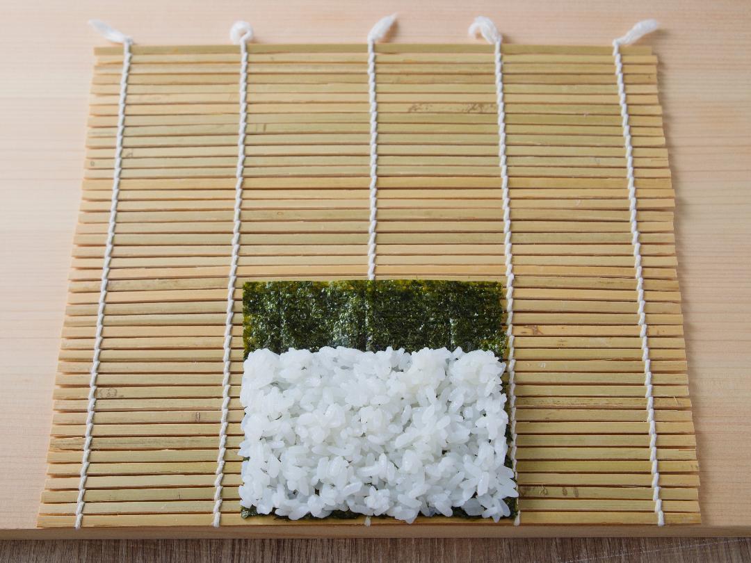 - 3巻きすの上に小さい焼のりを横長におき、上部を3cm程あけて白いすし飯を広げ、手前から巻く。