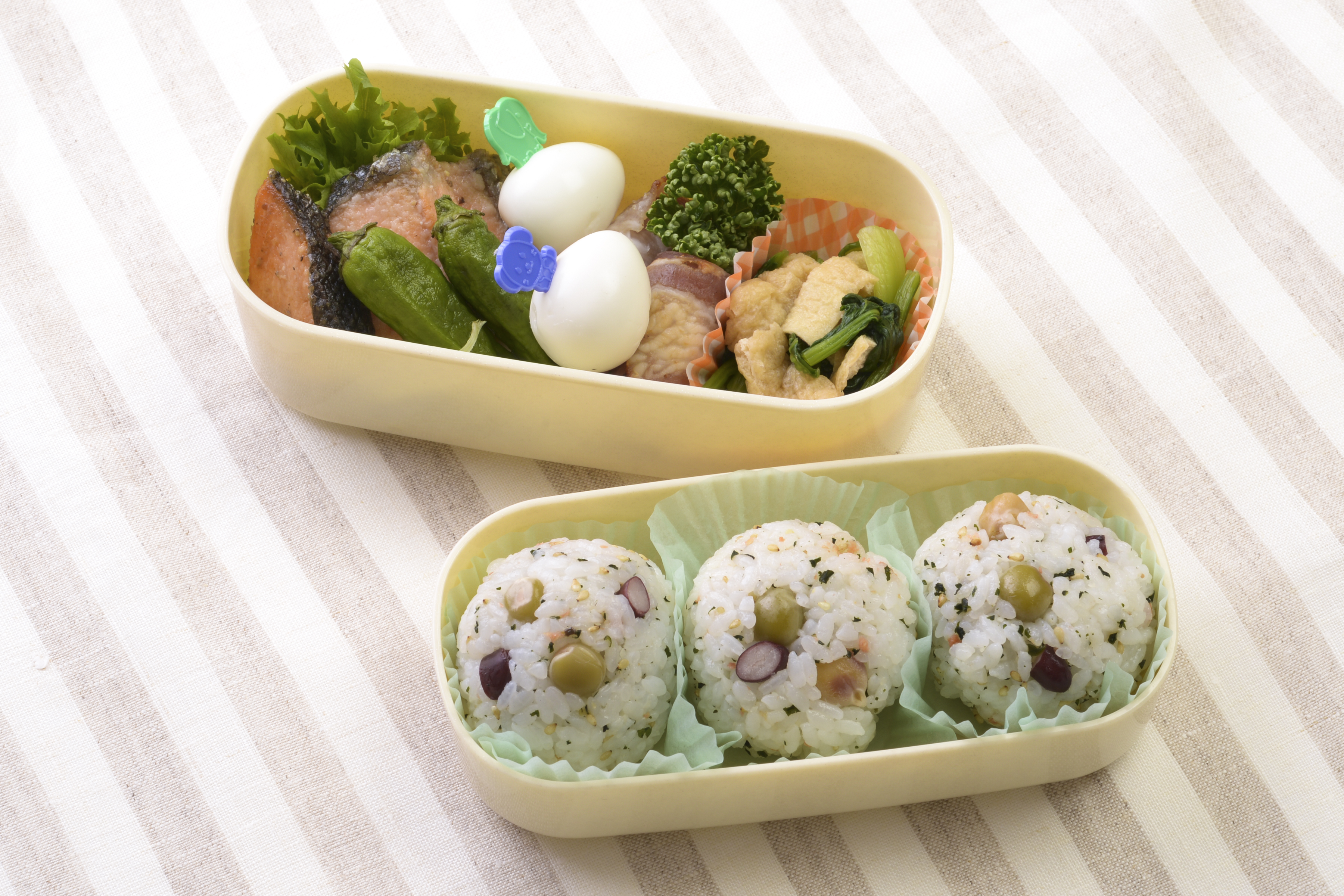 - 1ご飯160gに「おむすび山 鮭わかめ・青菜」をそれぞれ混ぜ合わせる。ラップに丸く握り、リボンワイヤーなどでくくる。