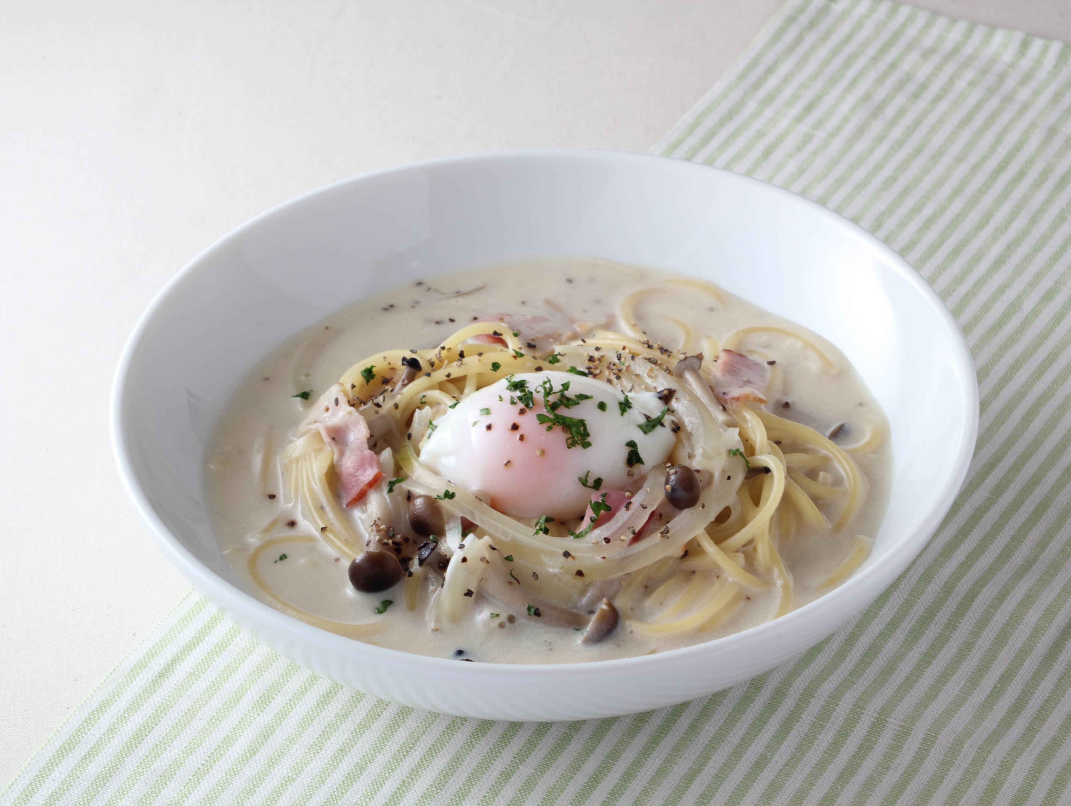 - 3スパゲティをゆでて皿に盛り、2のソースをかけて温泉卵をのせ、黒こしょうを振る。