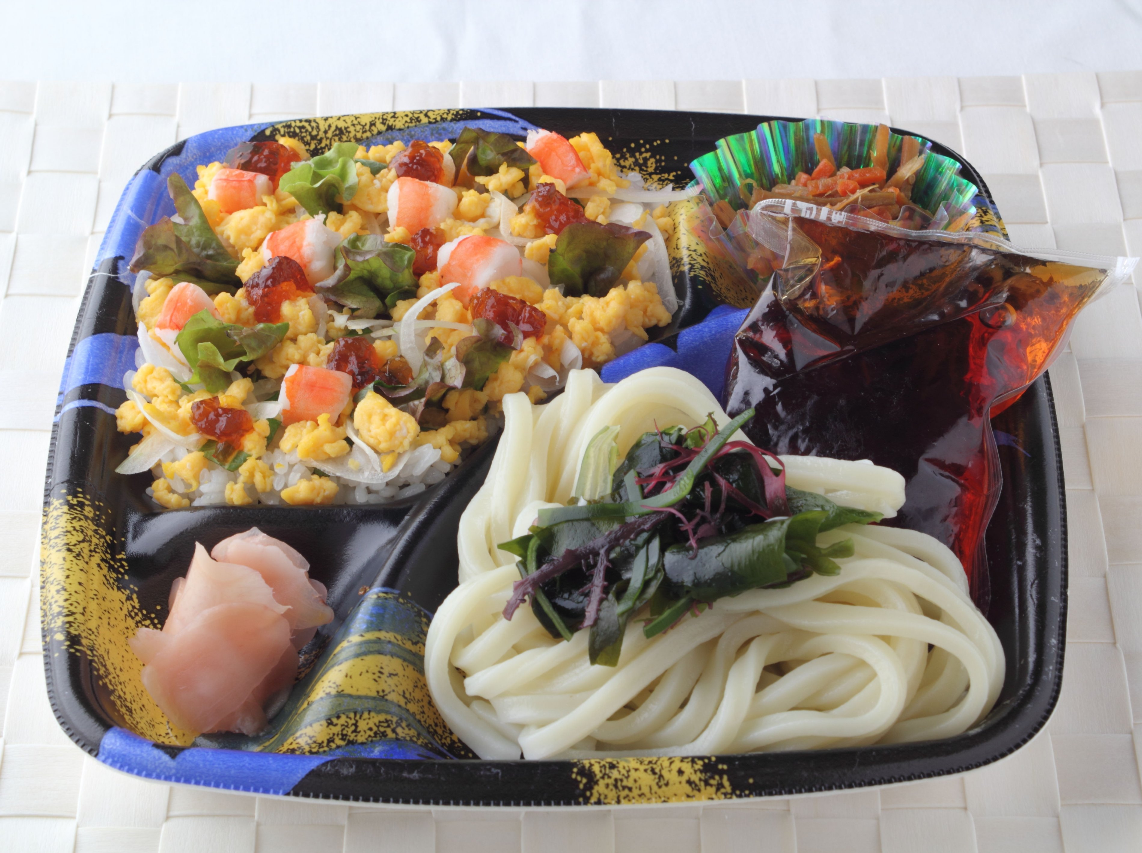 - 3容器にうどんを盛り、水でもどした海藻サラダをのせ、袋入りのつゆを添える。グラシン容器に入れたきんぴらごぼうをのせ、甘酢しょうがを盛り付ける。