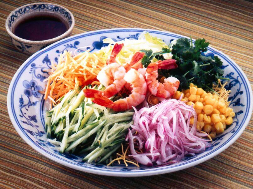 揚げめん(かた焼きそば)をサラダと一緒にいただくベトナム仕込みのピリ辛めん。