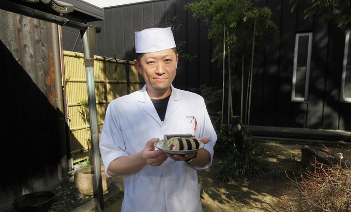 そこで「菊屋商店」(本社)からもらった有明産と兵庫県産の海苔を国道43号線を挟んだ向かいに位置する「さかばやし」へ持って行き、大谷料理長に寿司に使ってもらう事にした。「さかばやし」は、清酒「福寿」を産する「神戸酒心館」の敷地内にある同蔵の直営日本料理店だ。なので「菊屋商店」にとっても古くからつきあいのある隣り組なのだ。「菊屋商店」から届いた二種(有明産と兵庫県産)は焼き海苔で、味見した大谷料理長は「有明産は黒くてしっかりしていた。兵庫県産は磯の香りが漂い、歯切れがよかった」との印象を抱いた。なので有明産で巻き寿司を作り、兵庫県産は赤貝の軍艦巻きにしていた。巻き寿司には、焼き穴子・マグロ・茹で海老・椎茸・玉子を具材にし、しっかり詰まった感のある有明産海苔で巻いている。具の中でも形が崩れにくいとの理由から玉子は黄身カステラにしたようだ。