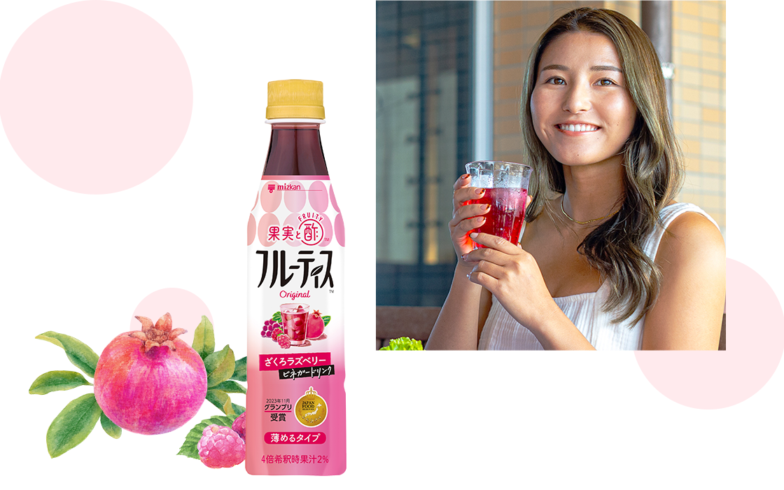 からだにやさしいお酢と、ざくろやラズベリー等の果汁を合わせ、カロリー控えめ※に仕上げています。程よい甘みと柔らかな酸味の甘酸っぱい味わいでさっぱりとリフレッシュできます。