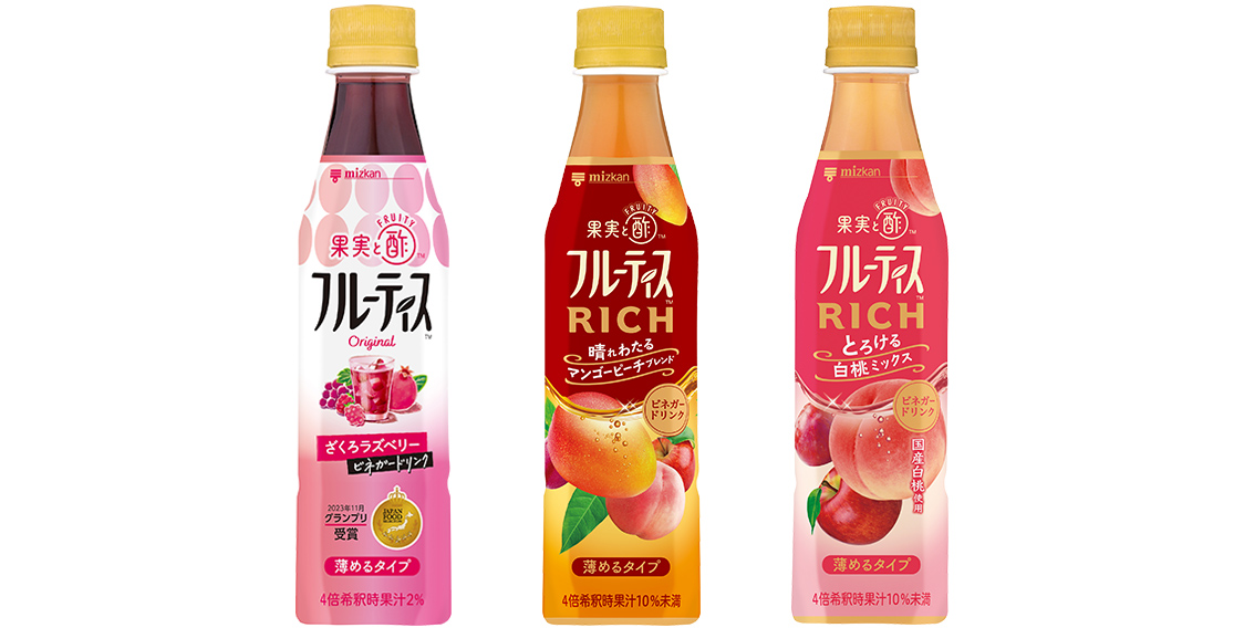 濃厚なフルーティーさがおいしい、りんご酢と桃、りんご、すももの果汁をミックスしたビネガードリンクです。フルーティーな甘さがしっかり感じられ、飲みごたえがあるようバランスよく仕上げています。