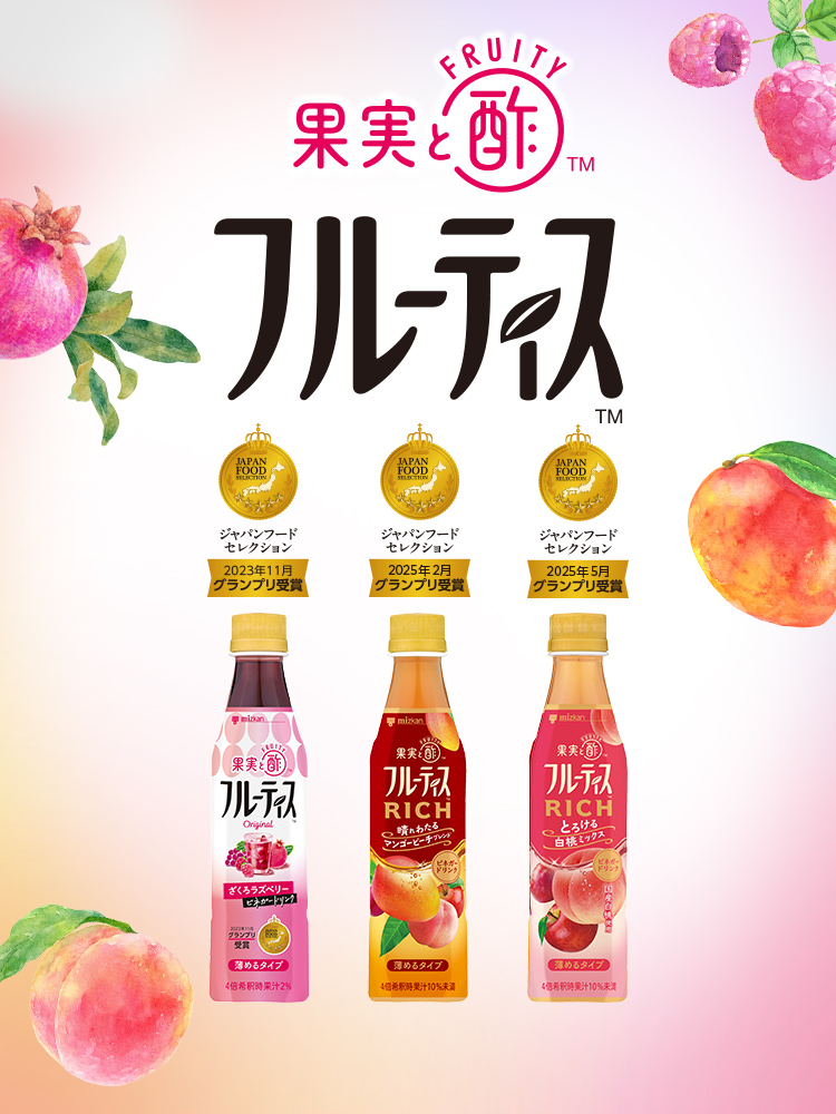 濃厚なフルーティーさがおいしい、りんご酢と桃、りんご、すももの果汁をミックスしたビネガードリンクです。フルーティーな甘さがしっかり感じられ、飲みごたえがあるようバランスよく仕上げています。