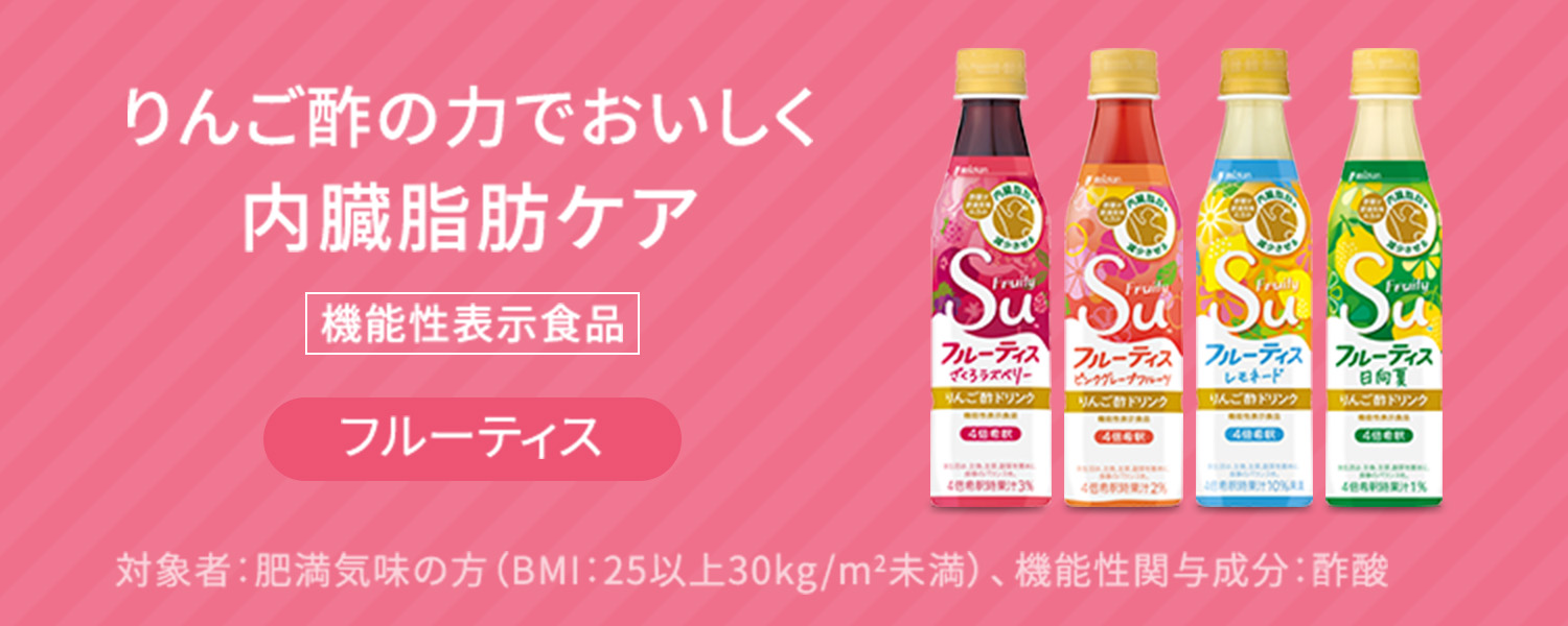 届出表示:本品には食酢の主成分である酢酸が含まれます。酢酸には肥満気味の方の内臓脂肪を減少させる機能、日常生活で生じる運動程度(5~6METs)の一時的な疲労感を軽減する機能があることが報告されています。